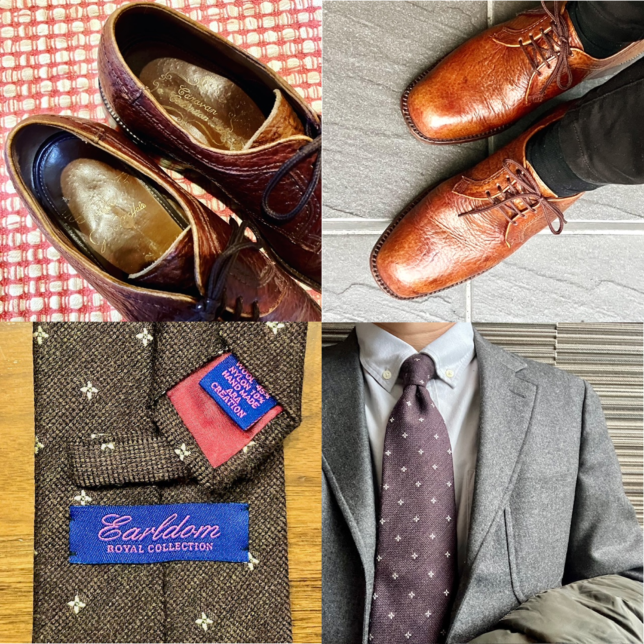 で、残ってるのがこの4本で、どれも厚手なやつ。やはり、普通のシルクのネクタイだと見た目も締め心地も値段相応、となりますが、厚手の素材感のあるものは、値の張るやつもそうでないのも見た目には区別がつきづらい。で、厚手のモノってそんな沢山あるわけでもないし、あっても値の張ることも多いので、ツープライスで手に入るのはありがたいな。ですが、すみません、その後はあまり買ってません。古靴漁りを始めて以降、ネクタイもセカストやメルカリのユーズドに取って代わられてしまった笑。