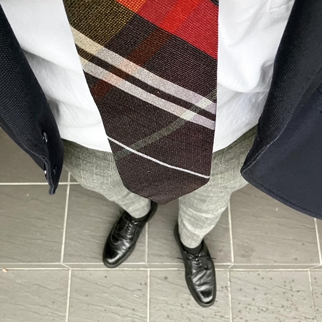 足元はア・テストーニ。黒い布タグのアッパーラインのやつです。イタ靴にしては分厚いソールが大のお気に入りで登板頻度多めのやつです。ネクタイはツープライスのやつ。安物ですが結構なお気に入りで、こちらも手持のネクタイの中では登板頻度多めです。3週目は「チェックのネクタイWEEK」にすることにしました。