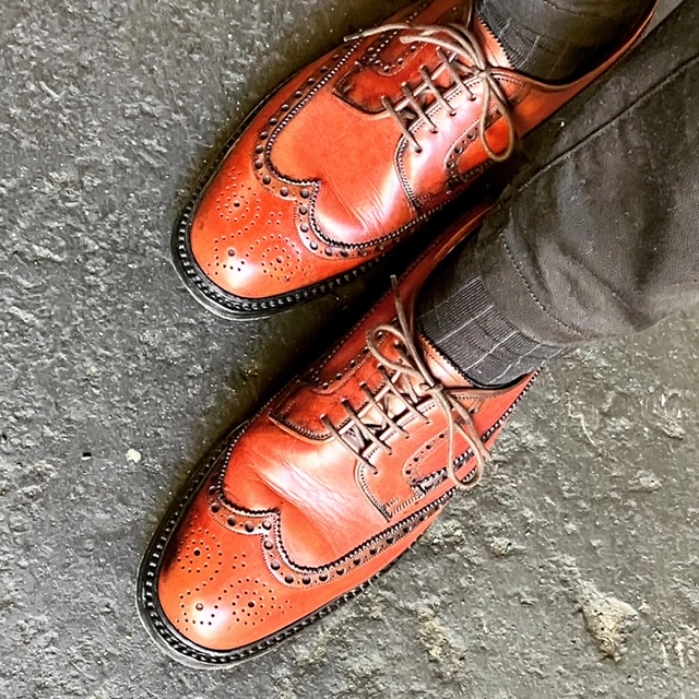 このところ英国靴づいてる私です。リユースショップで、のみならず、洋上にある2足(←なんだかんだで買ってる)のうち1足は英国靴。ちなみに、もう1足は東欧靴です。最近はアメリカンビンテージ靴のお買い得なやつをあまり見かけないような。特に、王道フローシャイムなどは年代が新しものが多く、新旧問わず円安でモノも送料もお高い。