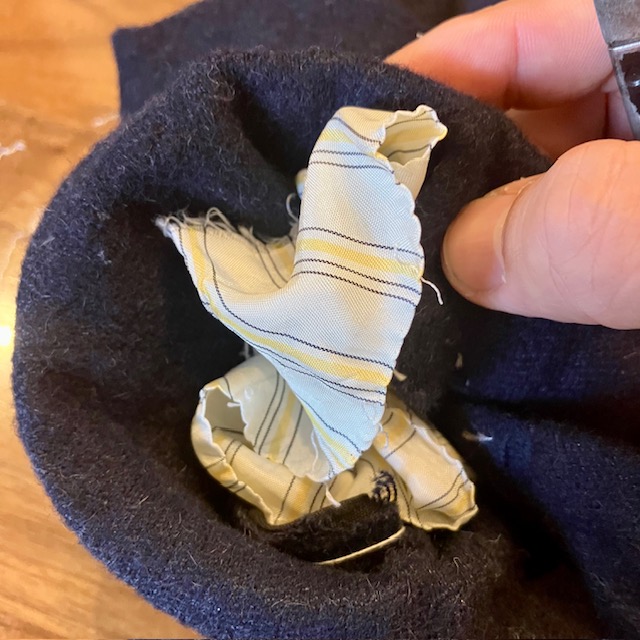 ちょうど表地の生地の端と元の折り目の中央辺りが新しい折り目、といった感じでしょうか。元の折り目の跡が結構きついですが取れるかな。まあ、生地は厚手で柔らかだし、色もネイビーで濃い。さらに、よおく見るとうっすらとヘリンボーンの折柄が入ってます。比較的目立ちづらい生地のようですので、上手くいくことを祈りましょう。