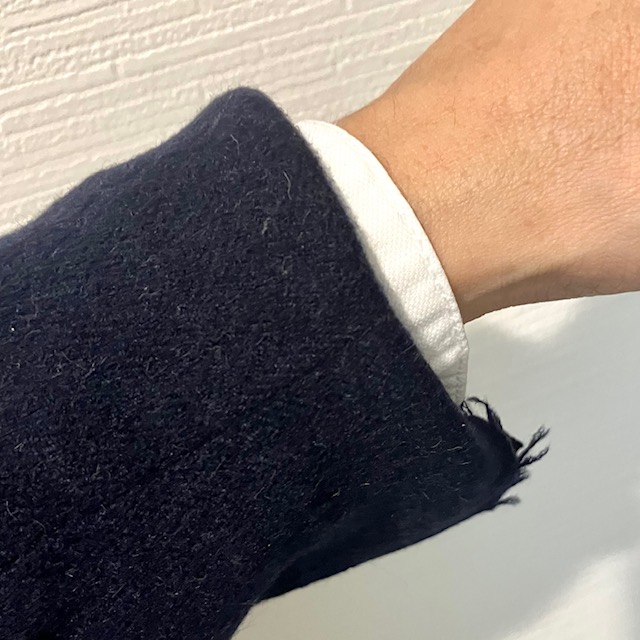1個つけ直しました。本切羽ではないのですが、ボタンホールを模したステッチがあります。これは私のスキルではどうにもなりません。まあ、誰も他人の袖口のステッチなんて気に留めないでしょう。とりあえずこのままで。