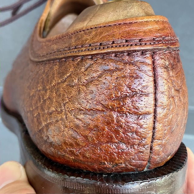 「Caravan Collection」というラインのペアのようです。セラー情報によりますとこの「キャラバンコレクション」とは、ゾウ・アザラシ・ラクダ・ウォーターバイソンなどのエキゾチック・レザーを用いたラインなのだそう。今回のこのペアは1970s前半ころのウォーターバイソンのペア、とのこと。